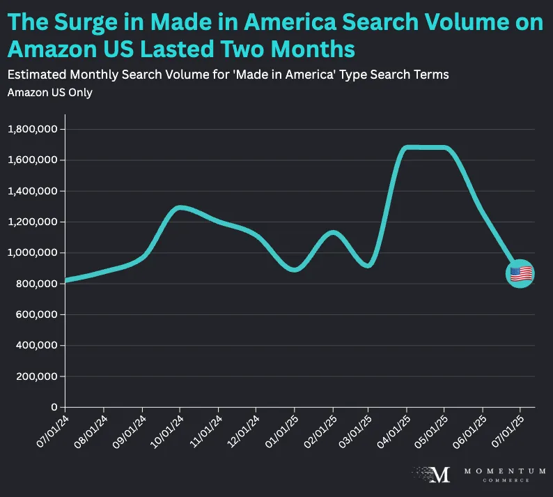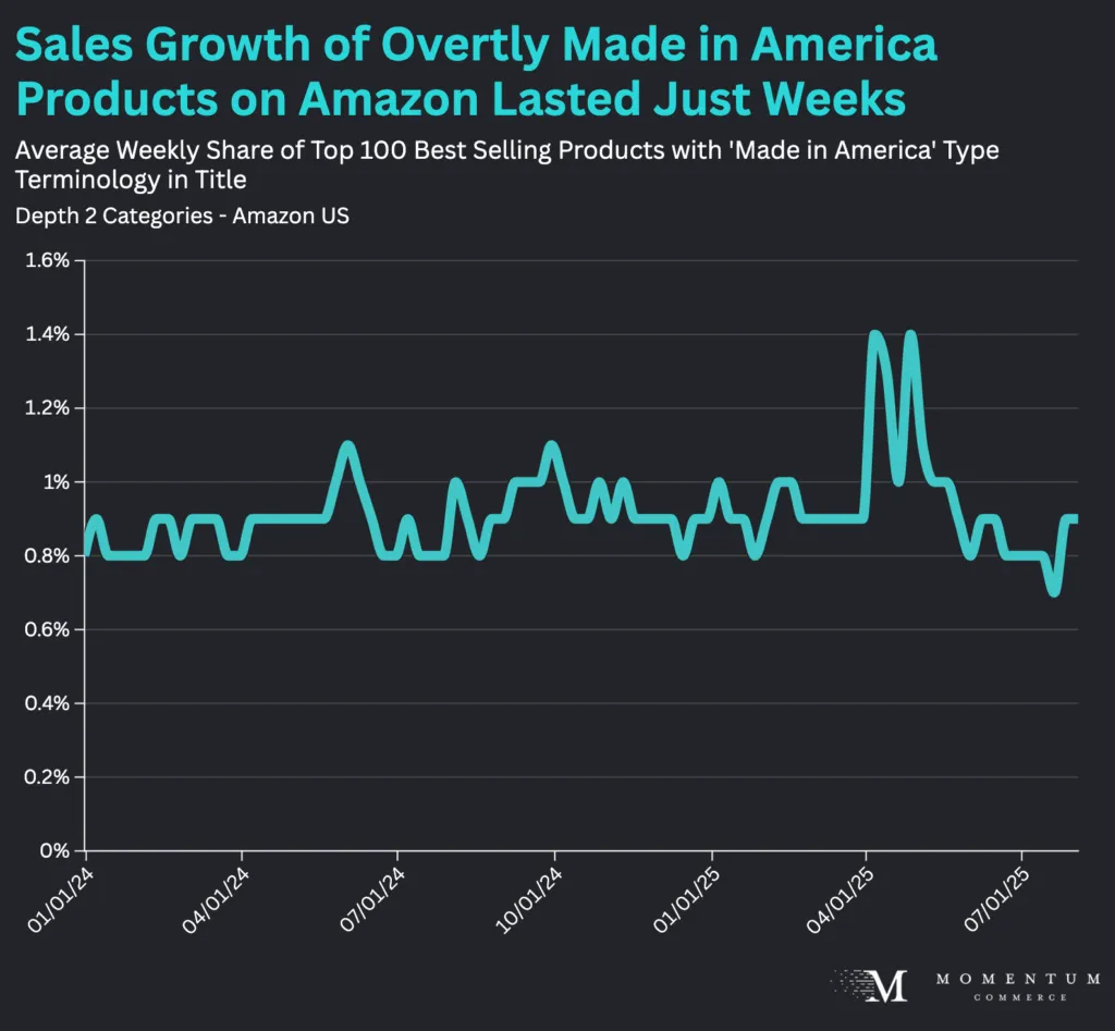 Back in the Spring, we studied how search interest on Amazon US for ‘Made in America’ type terminology had surged in April 2025. While that peak largely held the following month, it has since ebbed dramatically. By July 2025, search volume for terms including ‘Made in America’ and similar keywords fell back to levels largely identical with July 2024. This, combined with very short-lived growth in sales of these products and larger ASP trends, highlights how US consumers are considerably more focused on price than country of origin.