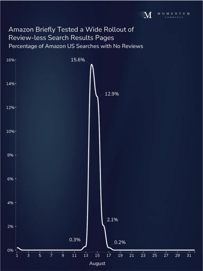 Between August 14 and 15, 2024, Amazon dramatically scaled the display of search pages with no reviews shown. On the August 14 peak, a full 15.6% of the top one million Amazon US search terms displayed no review counts, but this level quickly came back down in the ensuing days. This follows similar short-lived rollouts in both August and September of 2023, although each of those tests lasted more than a week.