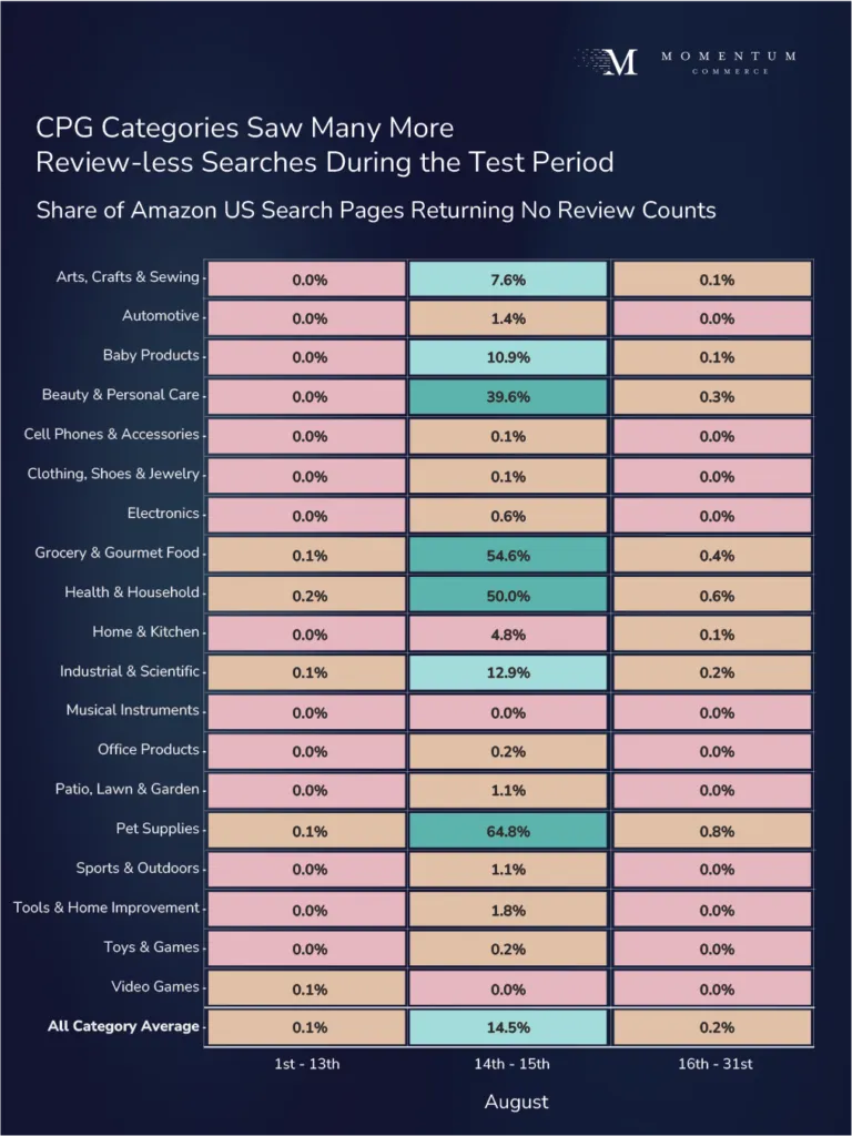 Another important difference is that, unlike the previous tests where no-review searches were roughly equally present across categories, this time around the impacted SERPs were primarily concentrated across CPGs.