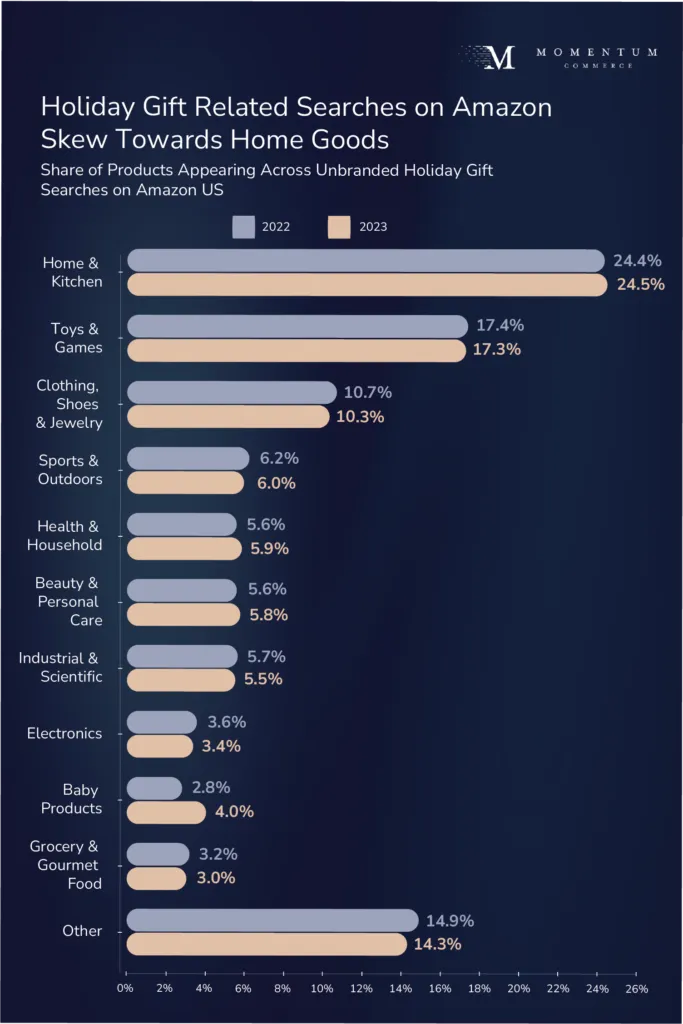 Momentum Commerce identified more than 2,700 search terms that were within the top one million search terms on Amazon during the month of November 2023 or November 2022 that contained “gift”, “gifts”, “present”, “presents”, “stocking stuffer”, “stocking stuffer”, or “toys for”, and also included no brand name. Additionally, search terms specifically referencing other events (e.g. birthday, easter, anniversary) were excluded from the analysis. Momentum Commerce then examined all products that appeared organically across the top 10 results on these searches between the dates of November 1 through December 22, 2022 and November 1 through December 22, 2023, including category, brand name and pricing information, for year-over-year comparisons.