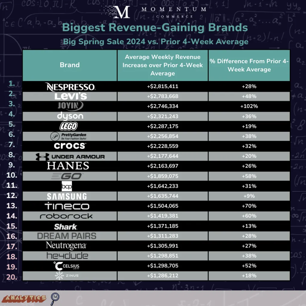 While Hanes, Levi’s, and Roborock discounted relatively steeply during the Big Spring Sale, that wasn’t the case across the vast majority of brands that grew period-over-period revenue the most during the event