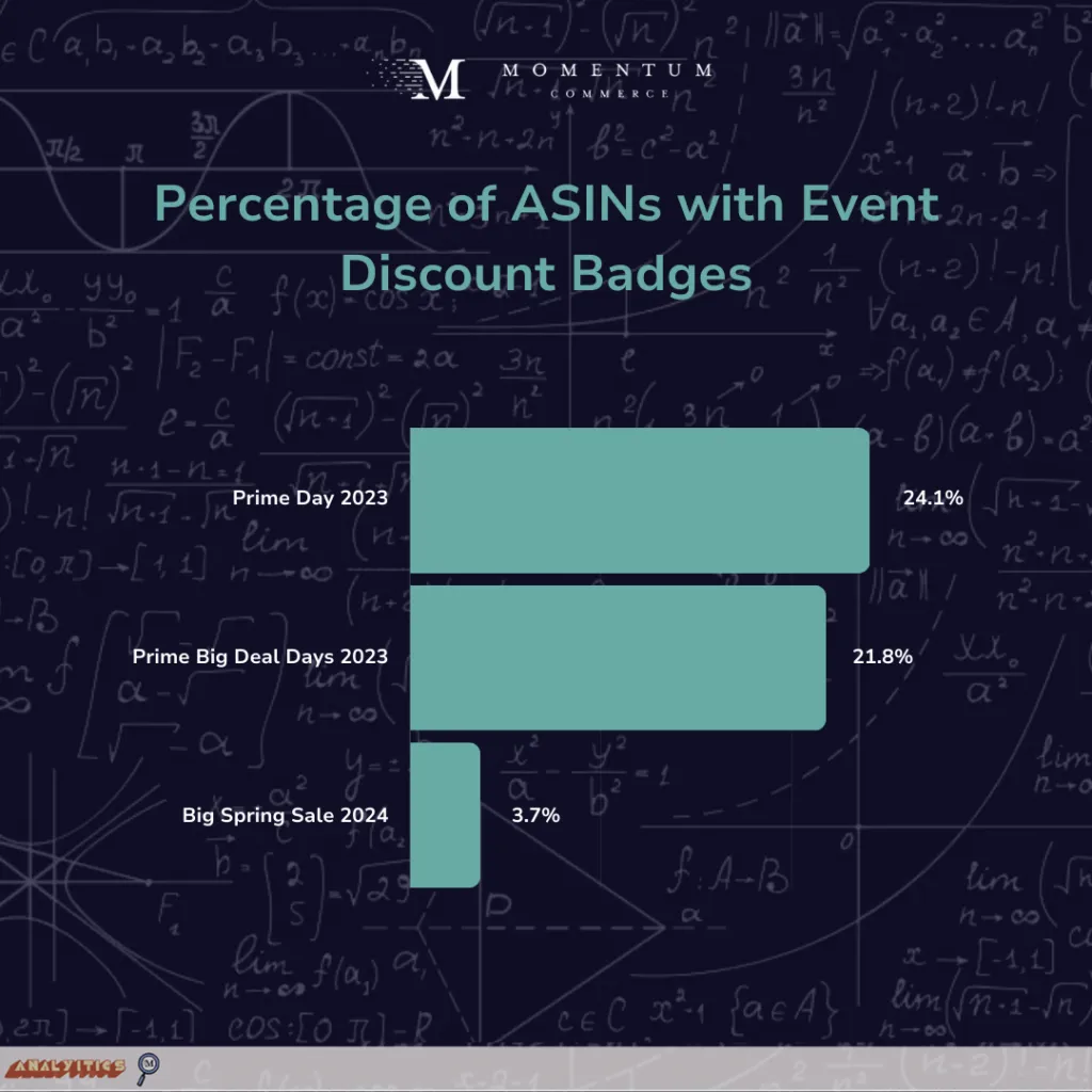 During the Big Spring Sale, an average of 3.7% of all products on Amazon US had the Limited Time Deal tag. Compare that with last Summer’s Prime Day(s) and Fall’s Prime Big Deal Days, when roughly 22% and 24%, respectively, of products had event-specific discount badges.