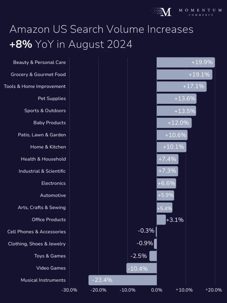 Beauty & Personal Care (+19.9%), Grocery & Gourmet Food (+19.1%), and Tools & Home Improvement (+17.1%) saw the largest YoY search volume gains