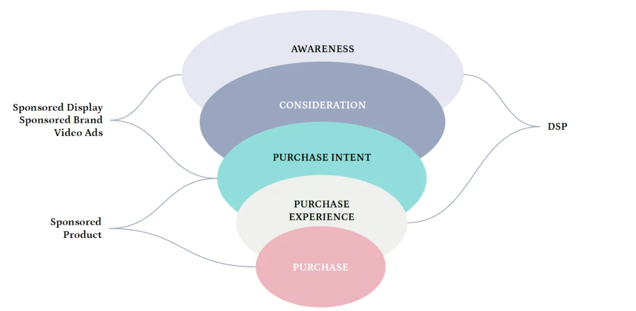 Marketers taking this step towards data-oriented decision making don’t have to abandon every top-of-funnel metric. Awareness still matters, and metrics like viewable impressions and product detail page views are goals that can be attached to DSP and Sponsored Display advertising on Amazon, for example. But in the context of retail media channels like Amazon, marketers can be exacting about committing resources to support the full customer journey, as seen below.