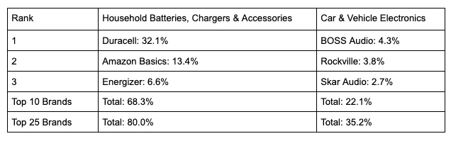 As can be seen above, “Household Batteries, Chargers & Accessories” has the highest Gini in the Electronics category, and is dominated by Duracell, which holds around 33% of the total SOV by itself. Conversely, “Car & Vehicle Electronics” has the lowest, with Boss Audio Systems, Rockville, and Skar Audio combining for only around 10% of SOV. If we examine these two categories, below we can see the Sponsored top 20 SOV from each of the top 3 brands, as well as the cumulative SOVs for top 10 and 25 brands.