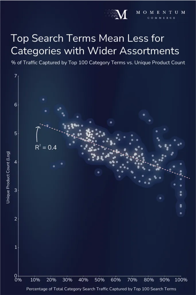 The share of consumer search activity captured by top terms on Amazon US varies significantly between categories. Assortment breadth within a category is a meaningful factor, with a reasonable correlation between the number of distinct products offered in a category and the share of total search volume captured by the top 100 terms for that subcategory.