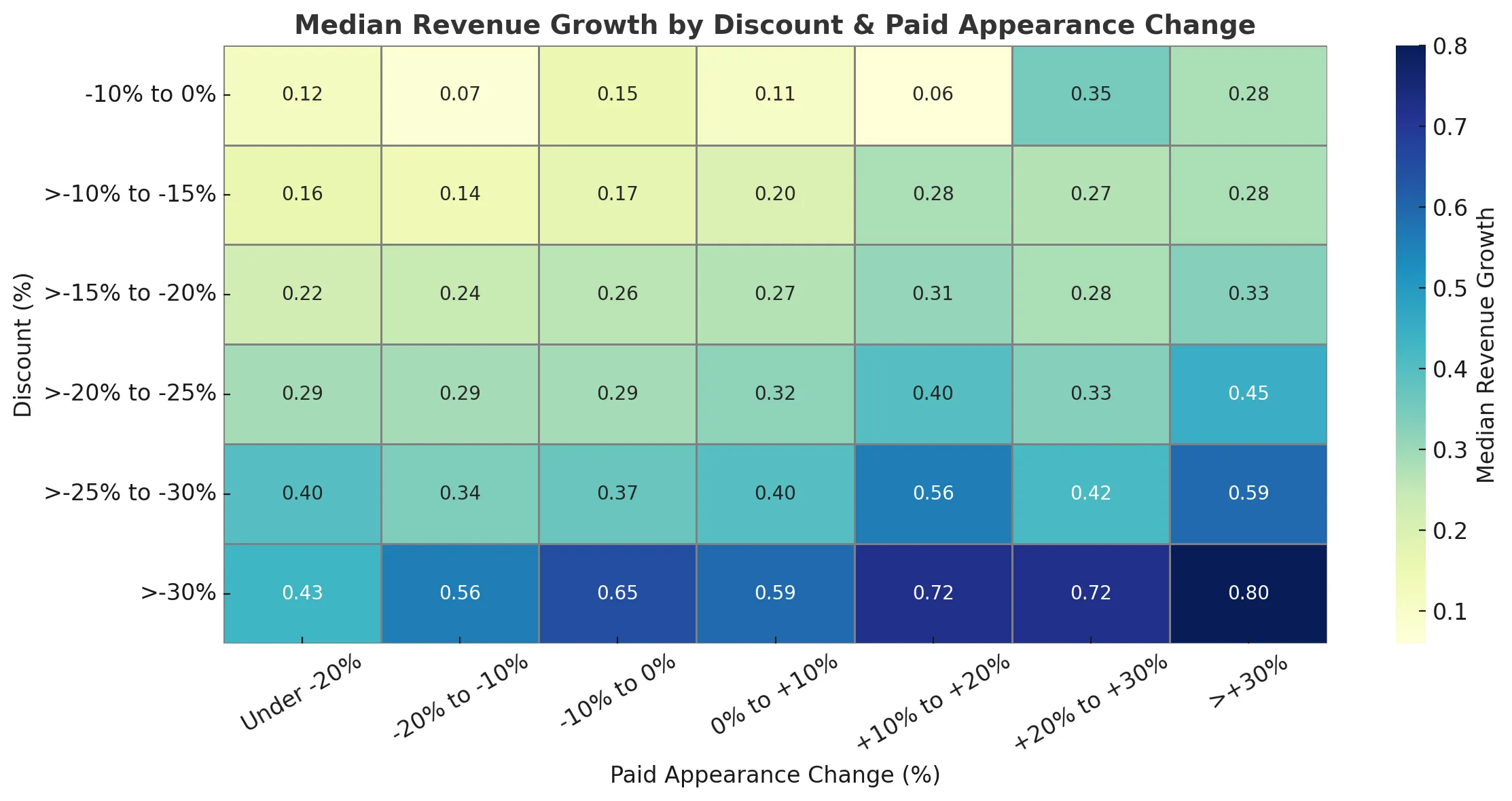 Comparative revenue change figures reflect the median period-over-period change in estimated weekly sales across all brands in each respective discount and paid appearance change bucket.