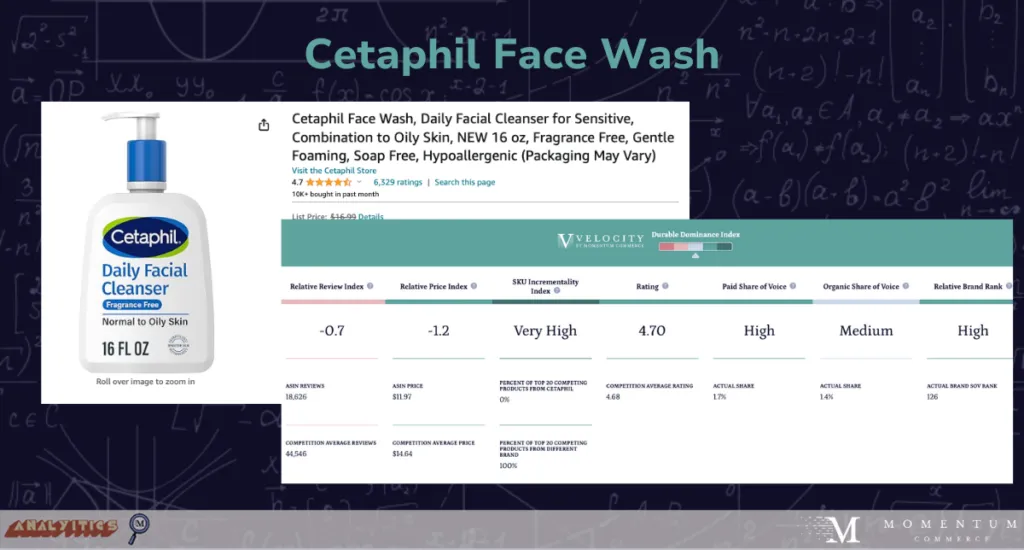 CeraVe’s top ASIN, the 19 oz. moisturizing cream for Face and Body is well positioned in terms of Momentum Commerce’s Durable Dominance Index across a number of areas including: