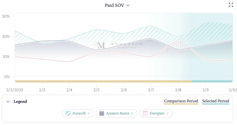 In a category dominated by Amazon Basics, with the private label brand commanding 27.1% of household battery revenue in January 2025, Duracell managed to increase their paid SOV by more than 6 percentage points during the Super Bowl period. No other competitor raised their paid SOV by even a single percentage point over the same time frame.