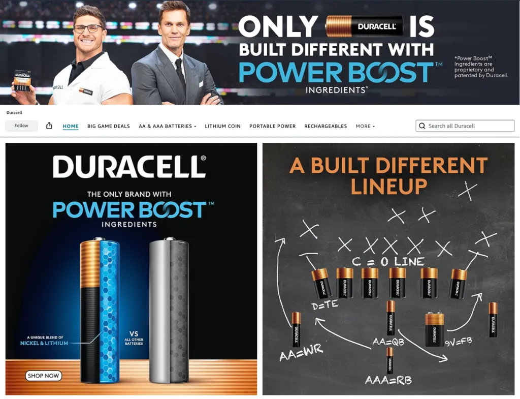 The battery brand leveraged Tom Brady's star power across both their Super Bowl commercial and Amazon presence, featuring him prominently in Sponsored Brand placements and their brand store.