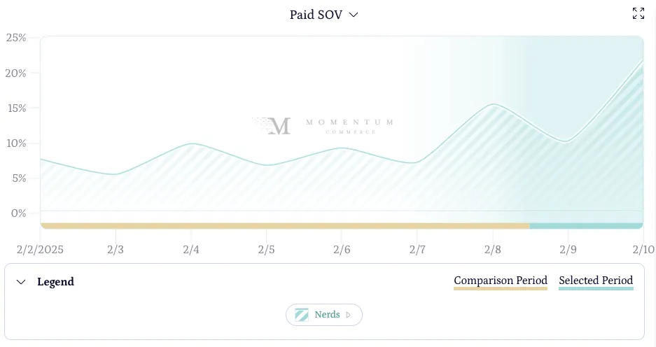 Nerds showed how to evolve a Super Bowl strategy year-over-year. The brand nearly doubled their paid SOV in the gummy candy category - from 8.54% to 16.05%.