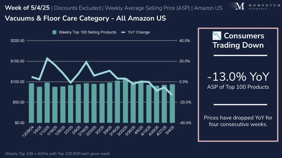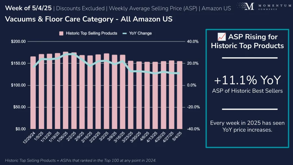 While consumers are choosing less-expensive Vacuum & Floor Care products, historic top selling products in the category are growing progressively more expensive. Across a consistent basket of products that achieved a top-100 BSR at any point in 2024, ASPs rose +11.1% YoY for the week starting May 4, 2025 in Vacuums & Floor Care.