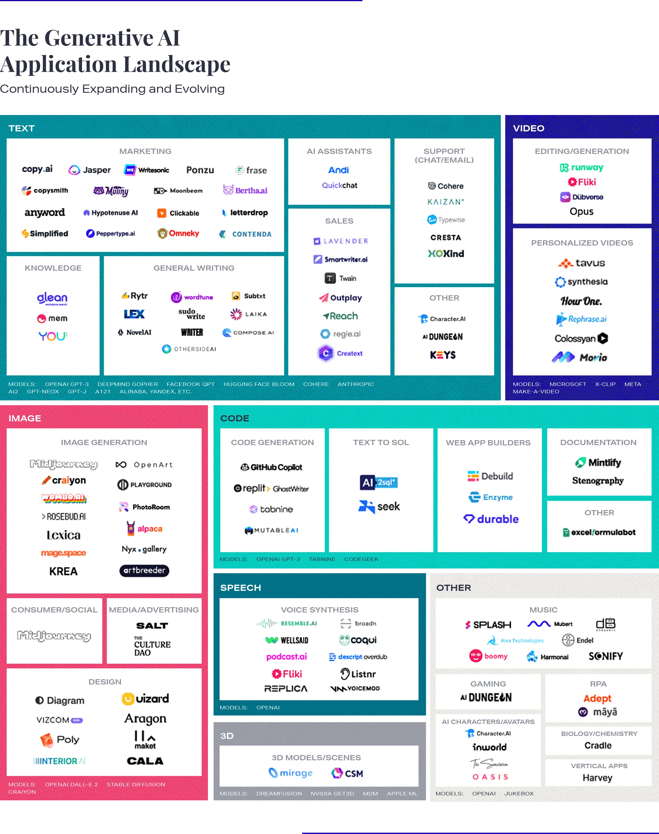 Catch Up: Defining Generative AIGenerative AI refers to a new class of AI tools that utilize neural network models to generate content, such as creative writing, art, and coding, as well as manage general- purpose tasks. While the concept first formed nearly a decade ago, a recent wave of generative AI developments has accelerated more sophistication while lowering the costs associated with running such complex workflows. Combined, these trends enabled research labs like OpenAI and Stability AI to recently expand from closed to open betas (and even some open source tools), unlocking new opportunities for app development, creativity, and exploration.