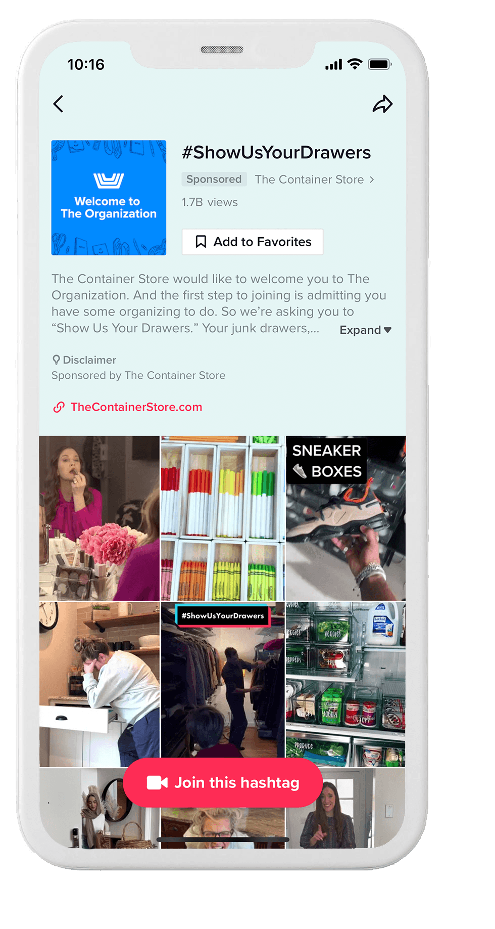On TikTok, The Container Store challenged users to share videos of their junk drawers, with the hashtag #ShowUsYourDrawers. The hashtag challenge, which enlisted influencers including The Home Edit, Marie Kondo, Cassandra Aarssen, and Drew Barrymore, among others, was amplified through a reach and frequency campaign on TikTok.